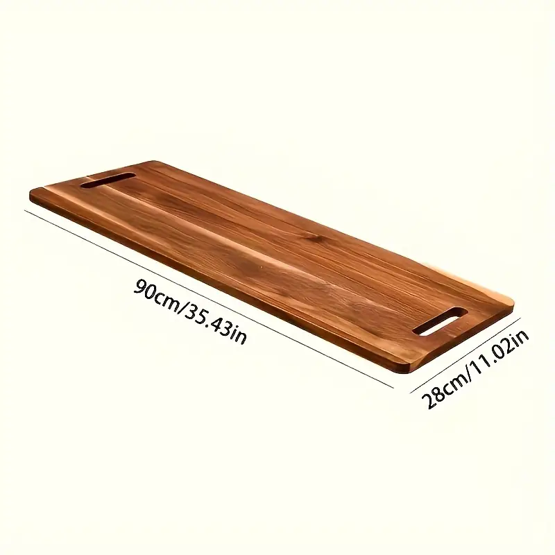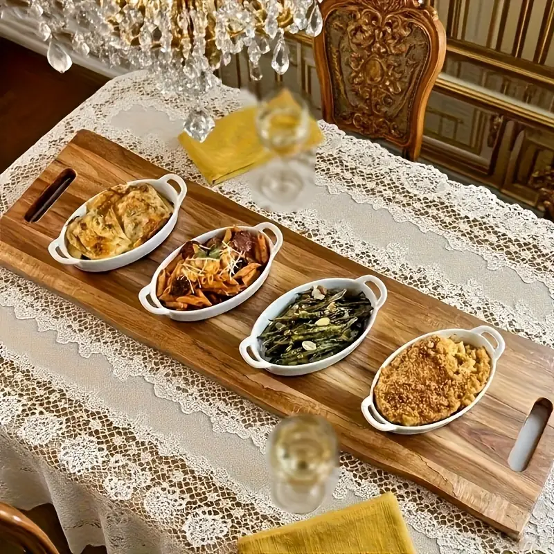 Деревянная наковальня, вечеринка, большой объем закусок, поднос с рукояткой, фруктовые тарелки, хлеб, ветчина, тарелки.