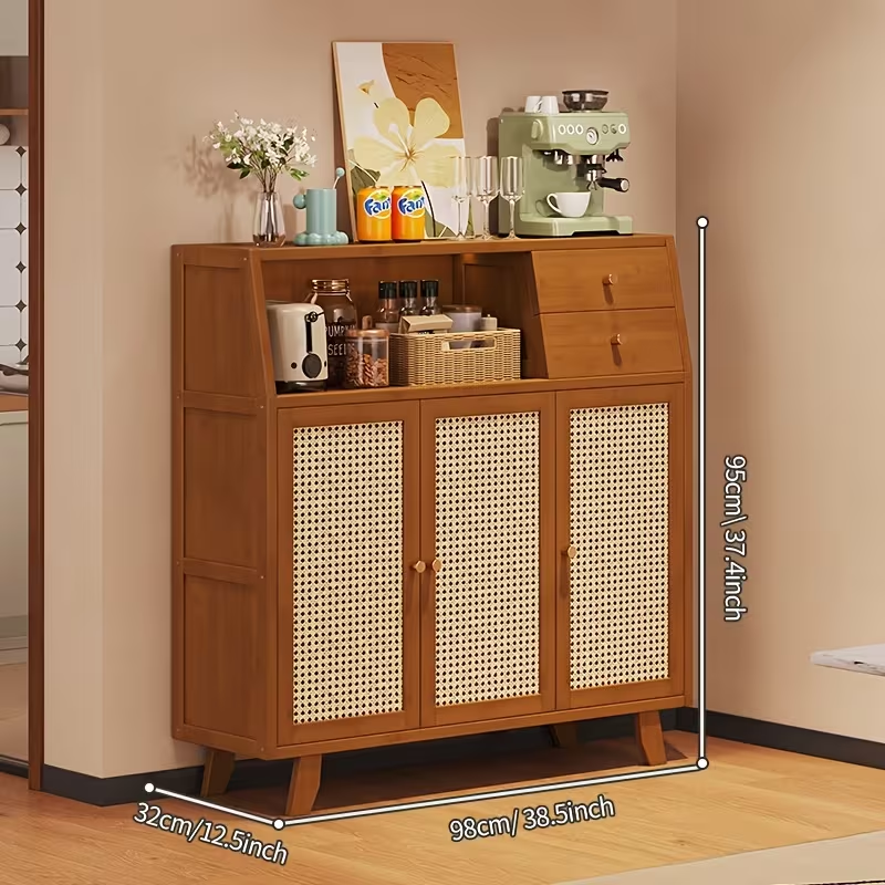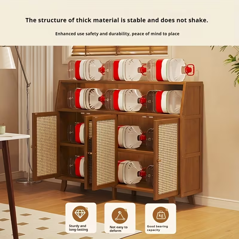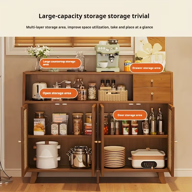 Научно-зонированная суперэкипировка: чайные сервизы, растительность, декоративные картины верхних уровней, моментально освещающие пространство; Средние ящики + закрытые шкафы, классифицированные столовые приборы, закуски, сухие товары, более безопасная защита от пыли; Нижняя часть зарезервирована для открытых пространств, которые могут содержать рисовые бочки, коробки для сбора урожая или свободные приборы, которые удовлетворяют различные потребности шеф-повара.