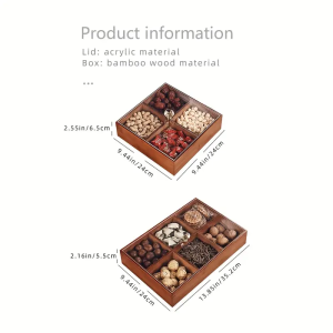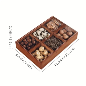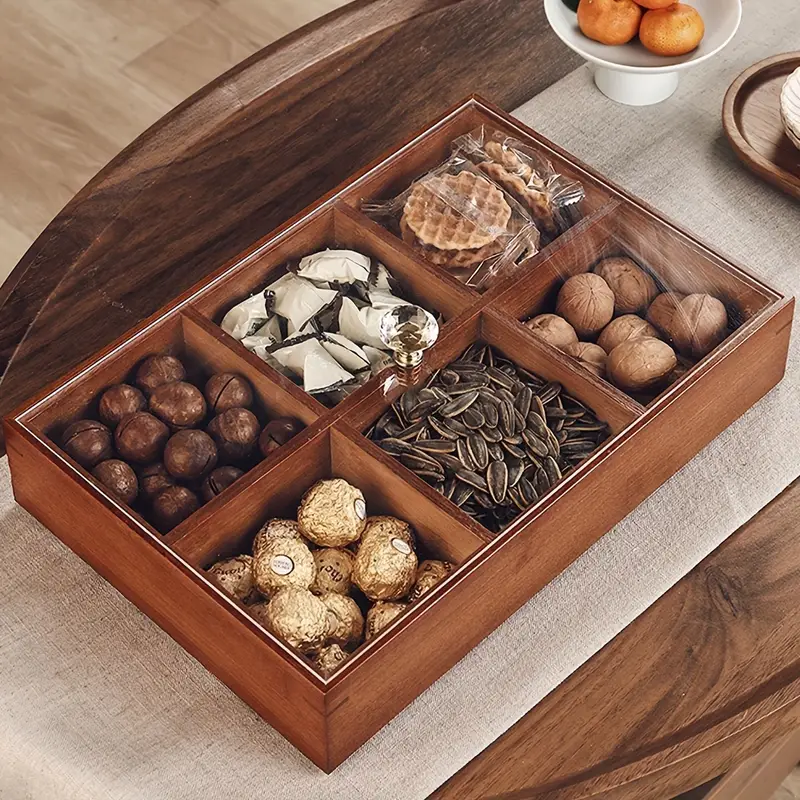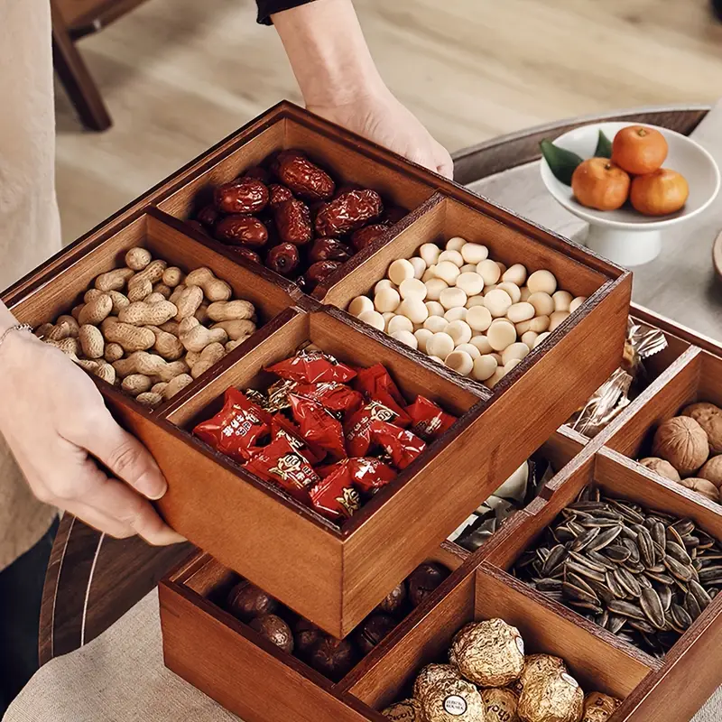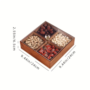Дизайн зонирования четырех дворцов очень практичен: грецкие орехи, баданское дерево, конфеты, фрукты могут быть классифицированы и размещены, чтобы избежать запаха, гости едят с первого взгляда; Каждая решетка имеет свою собственную герметичную крышку, может запереть свежесть сухофруктов, пыль и влагонепроницаемость, есть бесконечно без повторного поиска свежих мешков.